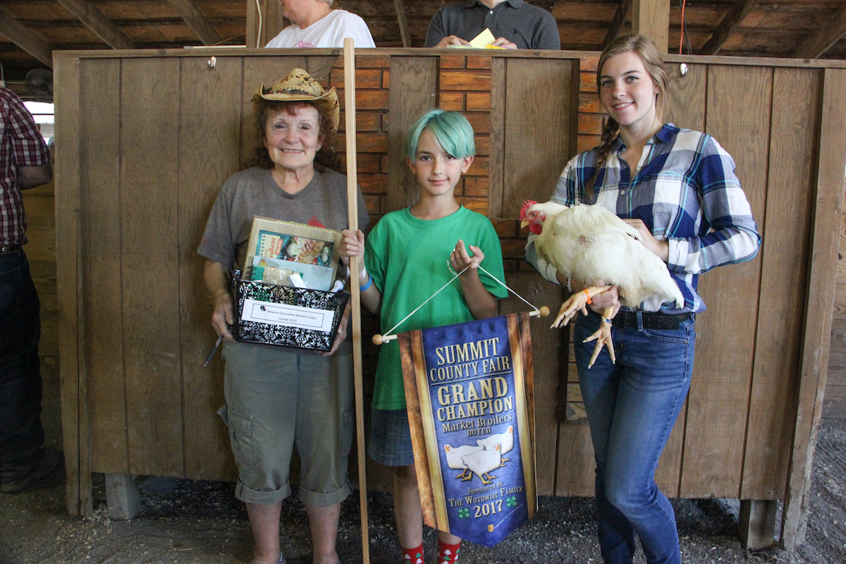The Summit County Fair grand champion market chicken pen, weighing 26.4 pounds, was shown by Cassidy Jordan and purchased by the Wotoweic family, represented Marilyn and Dylan Wotoweic, for $550. (Farm and Dairy photo)