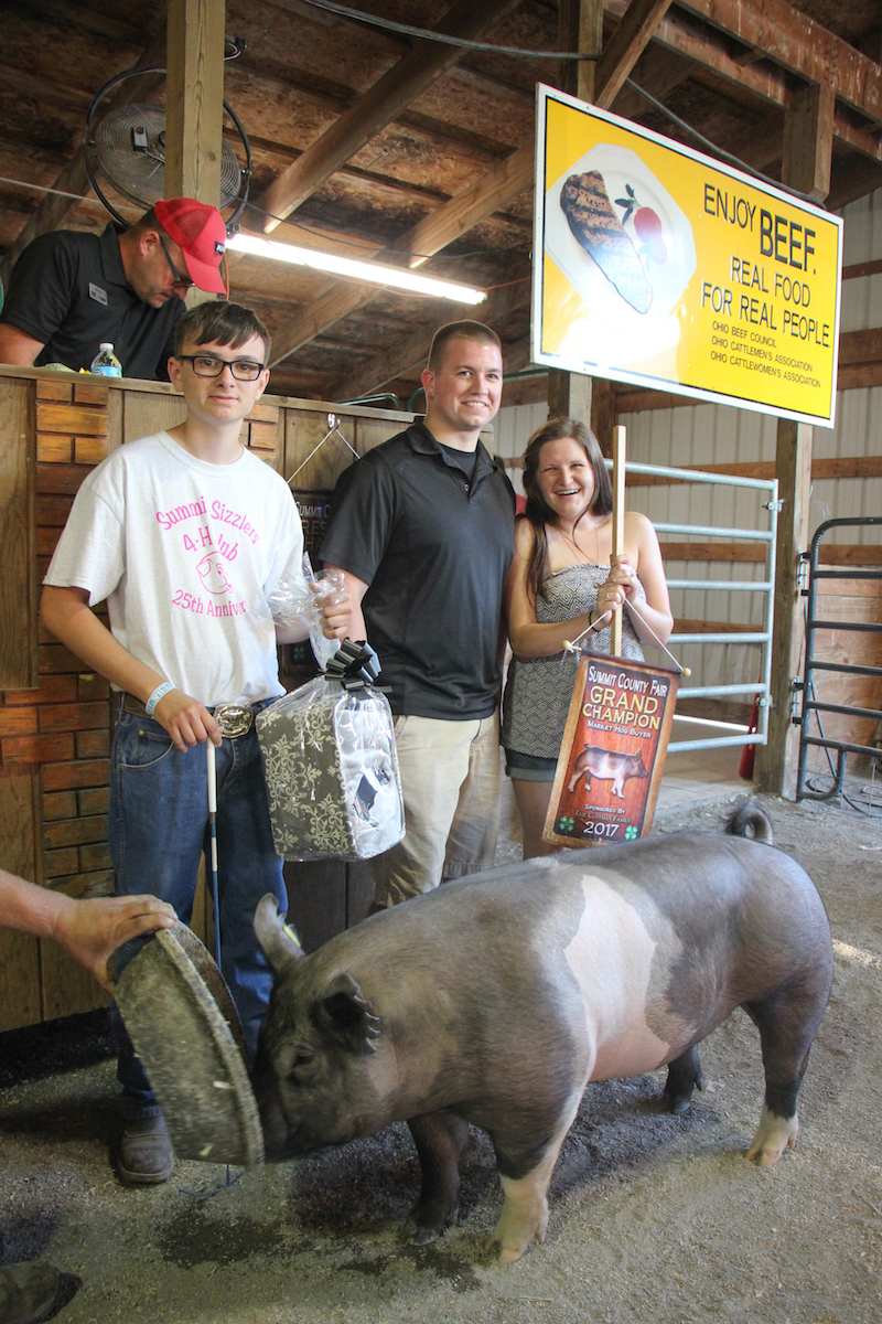 The Summit County Fair grand champion market hog, weighing 287 pounds, was shown by Corey Soulek and purchased by Ron Marhofer Auto Family, represented by Kyle and Abby Auckland, for a new record of $23 a pound.
