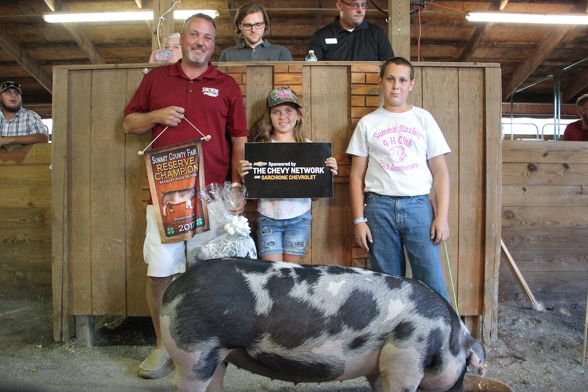 The Summit County Fair reserve champion market hog, weighing 240 pounds, was shown by Ethan Jones and purchased by Sarchione Chevy and Sarchione Ford, represented by Ron and Danika Ziler for a new record of $10 a pound.