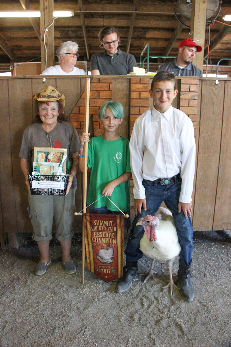 The Summit County Fair reserve champion market turkey, weighing 35.60 pounds, was shown by Nicholas Messina and purchased by the Wotoweic family, represented Marilyn and Dylan Wotoweic, for a new record of $850.
