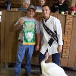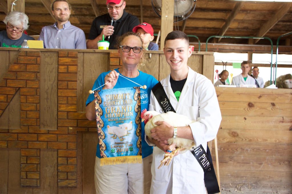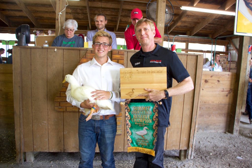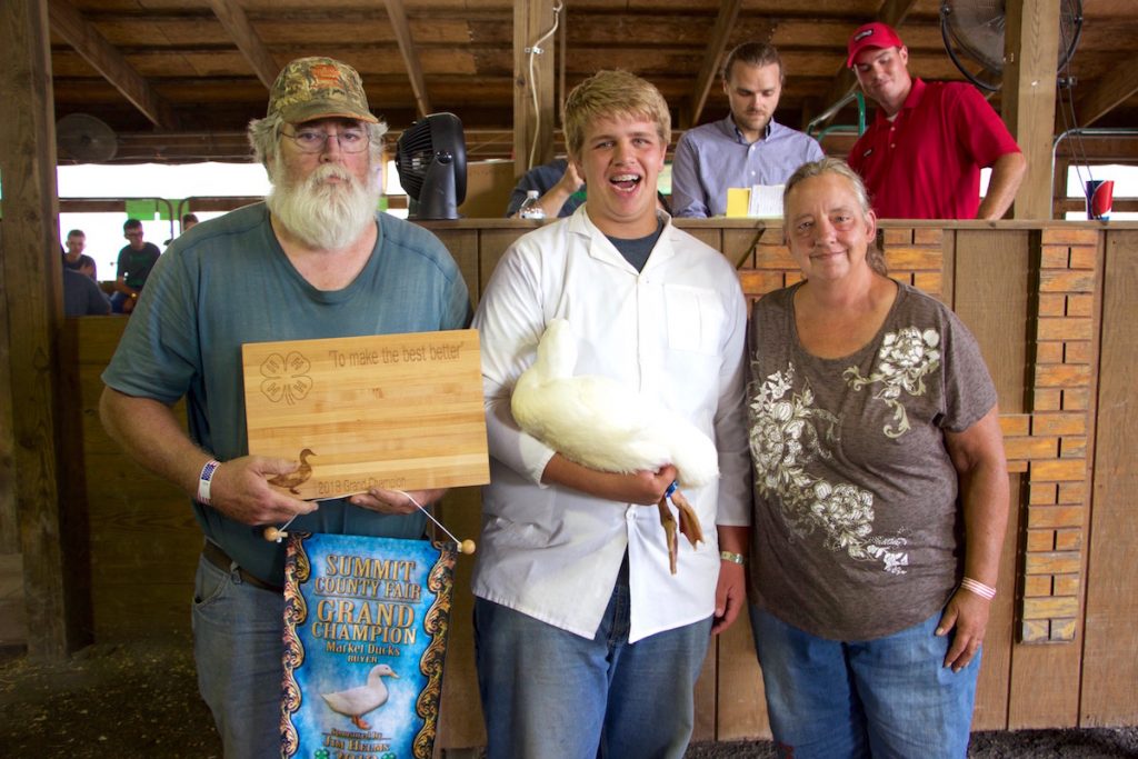 The Summit County Fair grand champion market duck, weighing 23.4 pounds, was shown by Cody Luther and purchased by Paul and Paula Hyde of Hyde’s Automotive for a new record of $925.