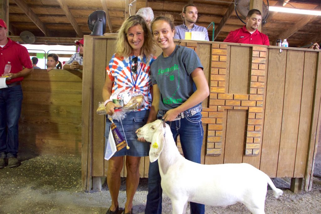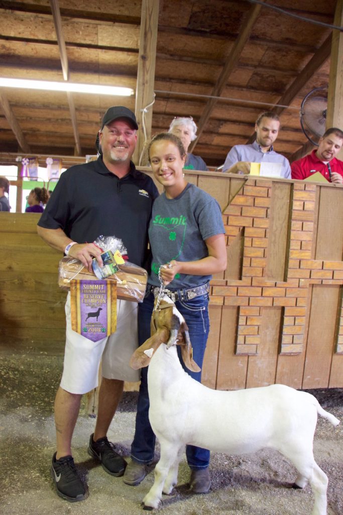 The Summit County Fair reserve champion market goat, weighing 83 pounds, was shown by Abi Jones and purchased by Sarchione Chevrolet, represented by Ron Ziler, for $500.