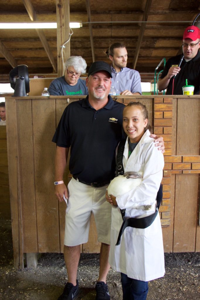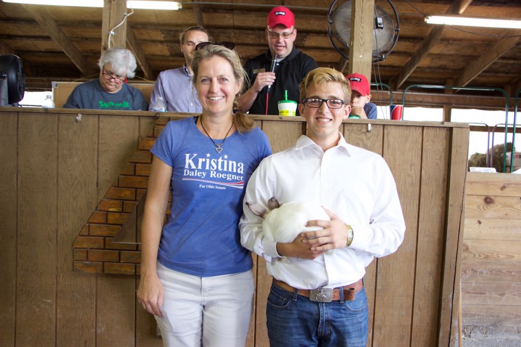 The Summit County Fair reserve champion market rabbit, weighing 13.9 pounds, was shown by Dylan Liepold and purchased by Kristina Roegner for Ohio Senate for $300.