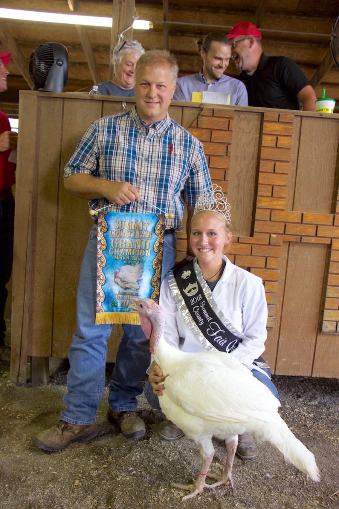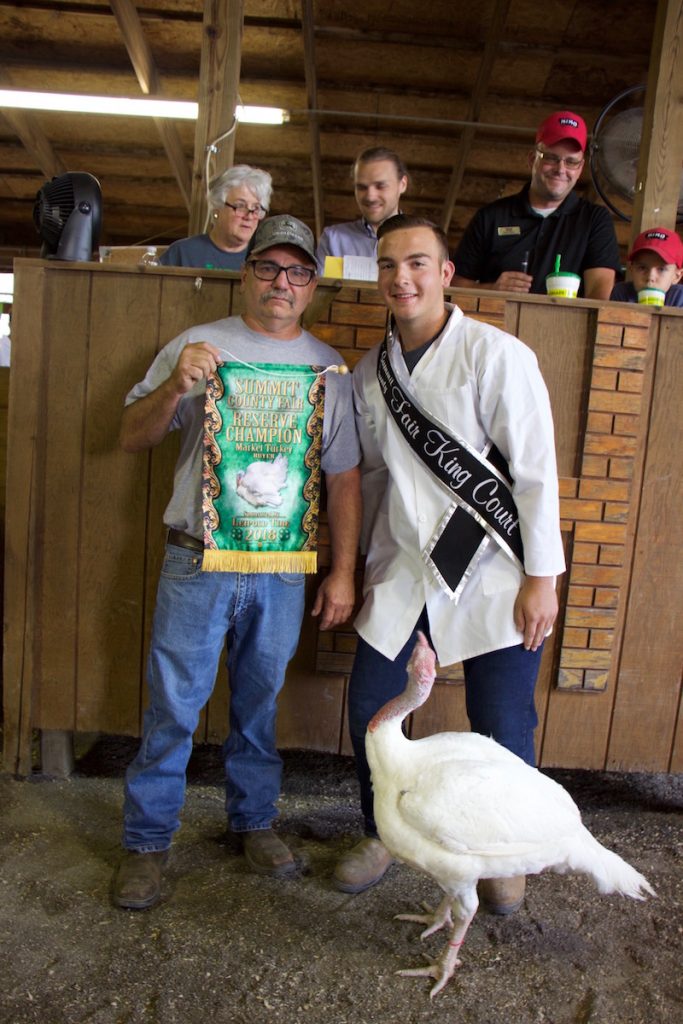 The Summit County Fair reserve champion market turkey, weighing 37 pounds, was shown by Stash Apana and purchased by Emmett Equipment Company, represented Chuck Soulek, for a new record of $950.