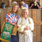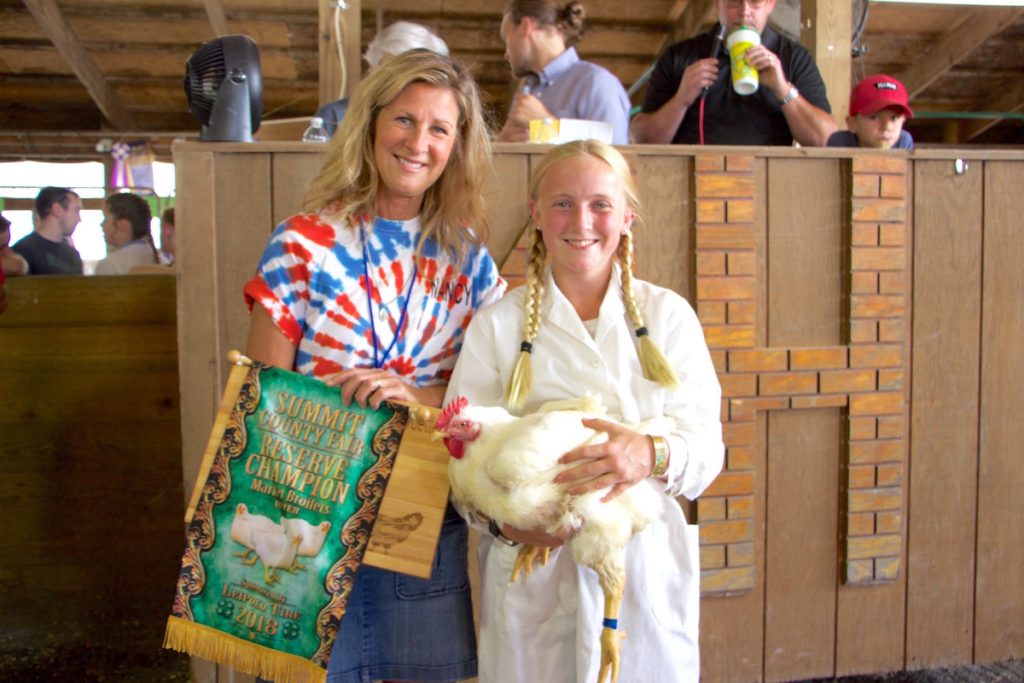 The Summit County Fair reserve champion market chicken pen, weighing 30 pounds, was shown by Kristine Roegner and purchased by Ron Marhofer Auto Family, represented by Nancy Marhofer, for a new record of $750.