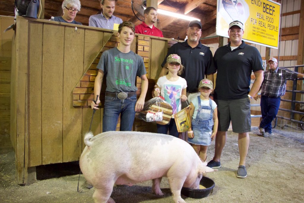 The Summit County Fair reserve champion market hog, weighing 264 pounds, was shown by Luke Coblentz and purchased by Sarchione Chevy and Sarchione Ford, represented by Ron and Zoey Ziler and Wesley and Piper Brechbiel for $9.50 a pound.