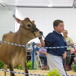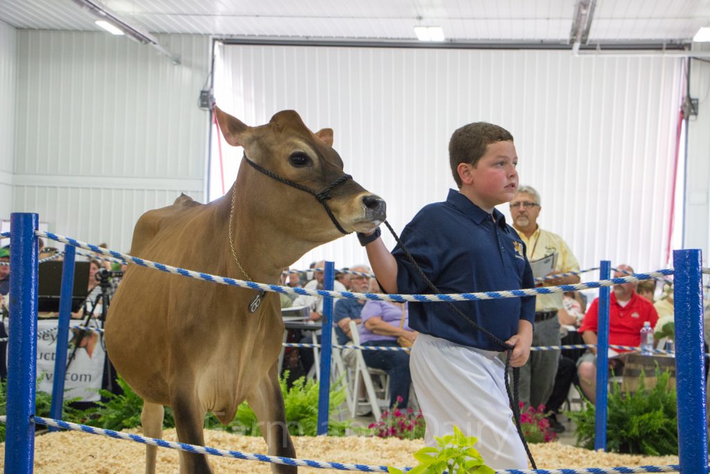 Youth volunteers lead Jersey heifers around the ring for the National Heifer Sale. PTJ Andreas Rudy-ET, shown here, sold for $3,100.
