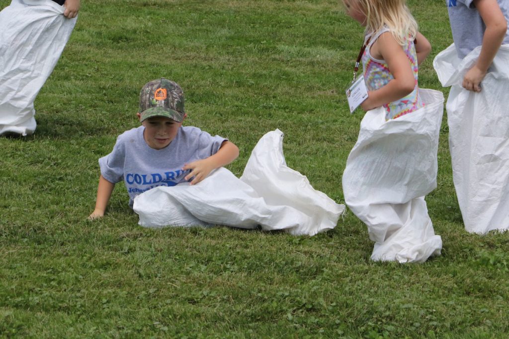 Man down: Max Holmes, son of Becky and Bryan Holmes, got tripped up during the sack races during the American Jersey Cattle Association tour of Cold Run Jerseys June 29. Max is the grandson of farm owner