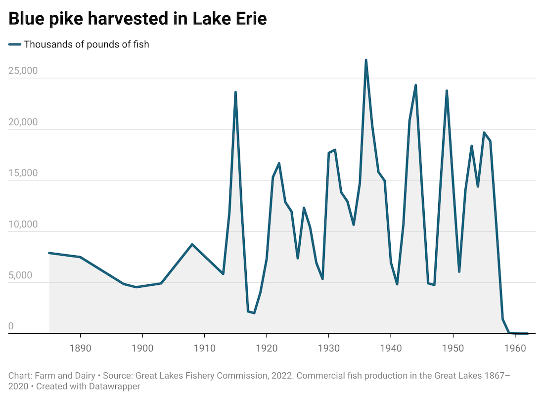 The Great Lakes Fishery Commission’s database lists the record harvest for blue pike as 26.8 million pounds in 1936. The harvests of the 1950s peaked at just under 20 million pounds in 1955 and remained above 10 million pounds through 1957.