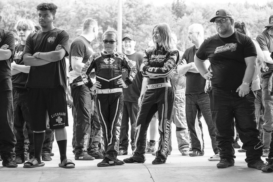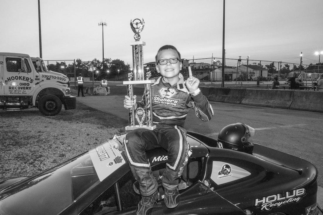 Her little brother Michael is having a very different kind of night. His car is running well. He just won the Bandalero heat race, and he would go on to win the feature. The 10-year-old has racked up four feature wins and seven top-five finishes in his fourth season of racing. When he’s not in a race car, he can be found around the pits with his camera in hand. Inspired by the late Billy McKinney, who was the track photographer at Norton, Michael started photographing race cars on his mom’s cell phone until he got his own camera.
