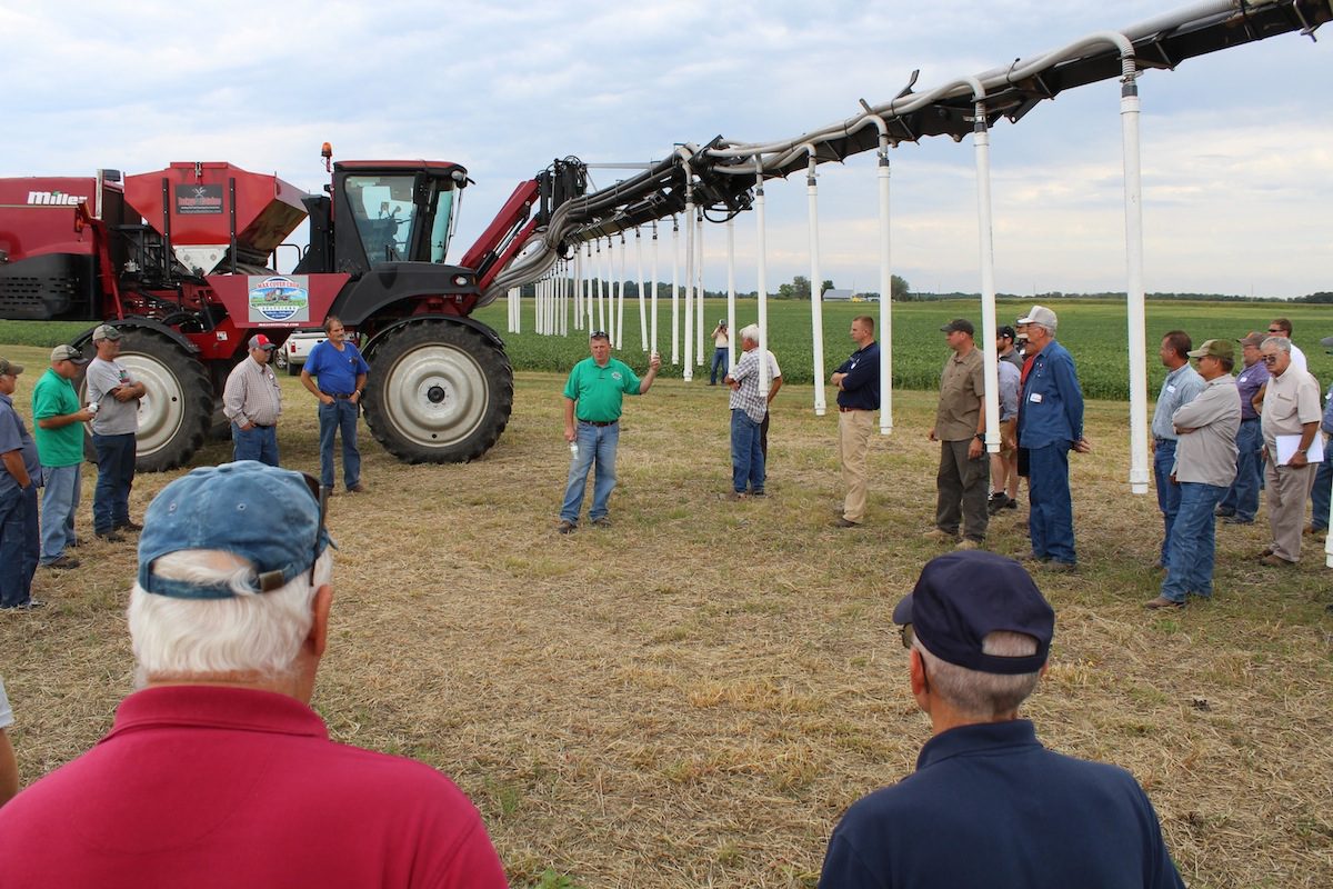 Representatives from Buckeye Soil Solutions in northwestern Ohio brought a field sprayer equipped with a cover crop planting mechanism, that deposits cover crop seeds between the rows of corn or soybeans, at a seed drop speed of about 130 mph.