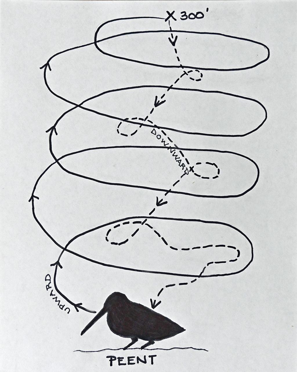 As is typical in the animal kingdom, the male is most often the one to show off, and with the American Woodcock, this display is no exception. When he reaches his highest point in the sky, any female woodcocks, whose attention he has garnered, sneak onto his peenting ground to await his return. Upon touching down, the male woodcock quickly mates with them and then immediately returns to his polygamous performance, which will last well into April. While you are listening to your woodcock, you may well hear other males performing in adjacent fields or witness males aggressively chasing each other across the breeding grounds. Woodcocks normally perform their sky dance at dawn and dusk, but on full moon nights, they are active for the duration.