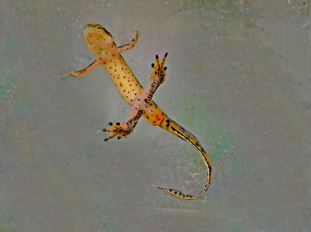 Once its transformation is complete, the aquatic newt, retaining its well-developed lungs, measures between 4 to 5 inches in length. In fact, in appearance, there is not a vestige left of its prior self, save the red spots outlined in black along its back and the golden eyes.