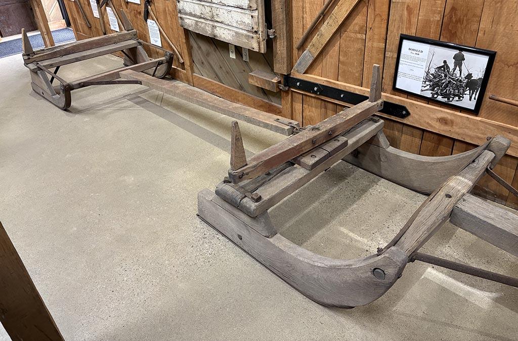 To collect the accumulating sap for boiling down, the settler utilized a bobsled equipped with a larger staved wooden tank. Bobsleds were large, horse-drawn vehicles having heavy wooden runners that made them ideal for working in the snow or mud. Bobsleds were also used during the winter and early spring for hauling firewood, blocks of ice and other heavy loads where wagons would become bogged down.