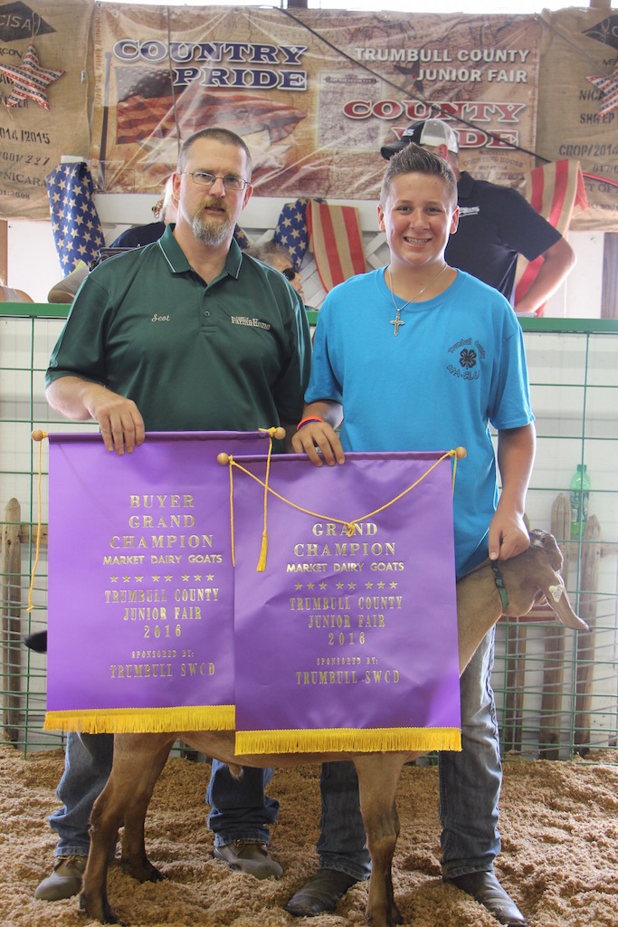 The Trumbull County Fair grand champion dairy goat, weighing 100 pounds, was shown by Jeremiah Adams and purchased by Scot Stover of Family Farm and Home for $5 per pound. Adams was also the winner of the rate of gain contest.
