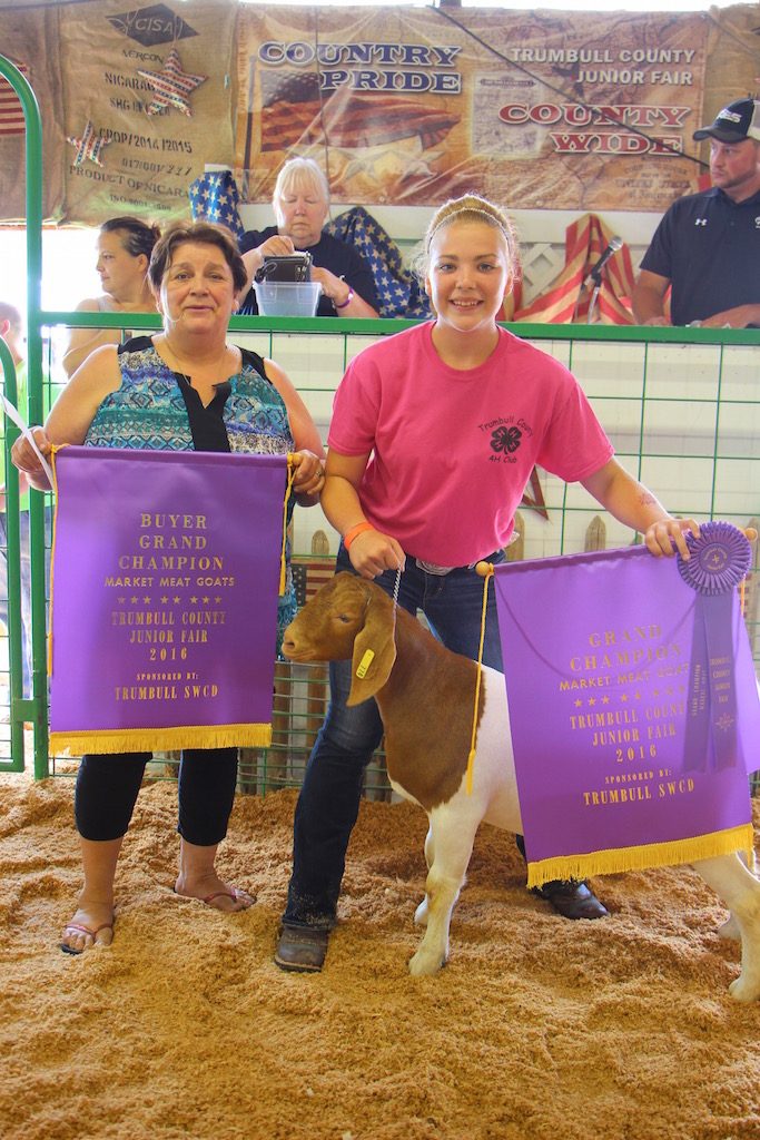 The Trumbull County Fair grand champion market goat, weighing 99 pounds, was shown by Courtney Hubbard and purchased by Cathy Hogue of Grand Mothers Who Care for $12 per pound.