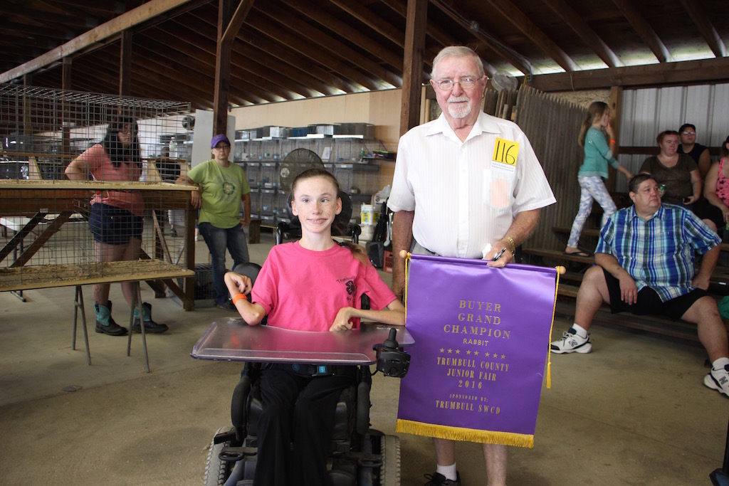The Trumbull County Fair grand champion pen of three market rabbits, weighing 12.80 pounds, was shown by Amber Jones and purchased by Richard Houk of Green and Golden Farm for $300.