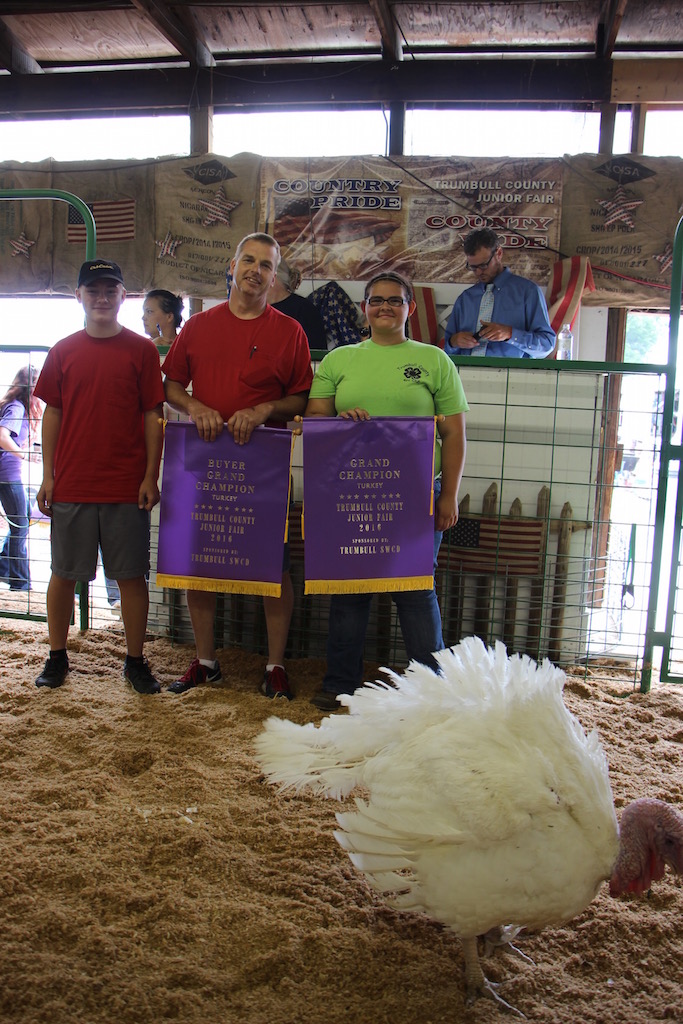 The Trumbull County Fair grand champion market turkey, weighing 56.3 pounds, was shown by Summer Gaylog and purchased by Caleb and Brian Carlson (left to right) of BC Automotive Inc. for $10 per pound.