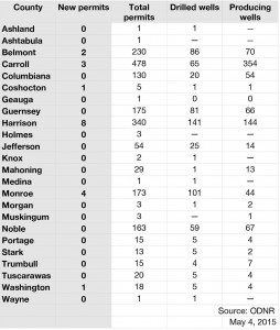 Harrison and Monroe counties are leading the pack in April 2015. There were eight new permits issued by the ODNR in Harrison County last month. All of the permits were issued to American Energy Utica for two different well pads on two different properties. All of the wells will be located in Nottingham Township.