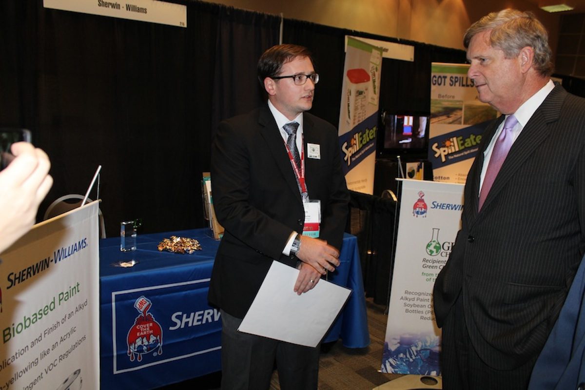 Vilsack and his federal staffers visited each booth at the show — observing such things as bio-based paint, construction material, packaging and shipping material, food service supplies, cleaning supplies and automobile supplies — all made in part from plant and agricultural products.