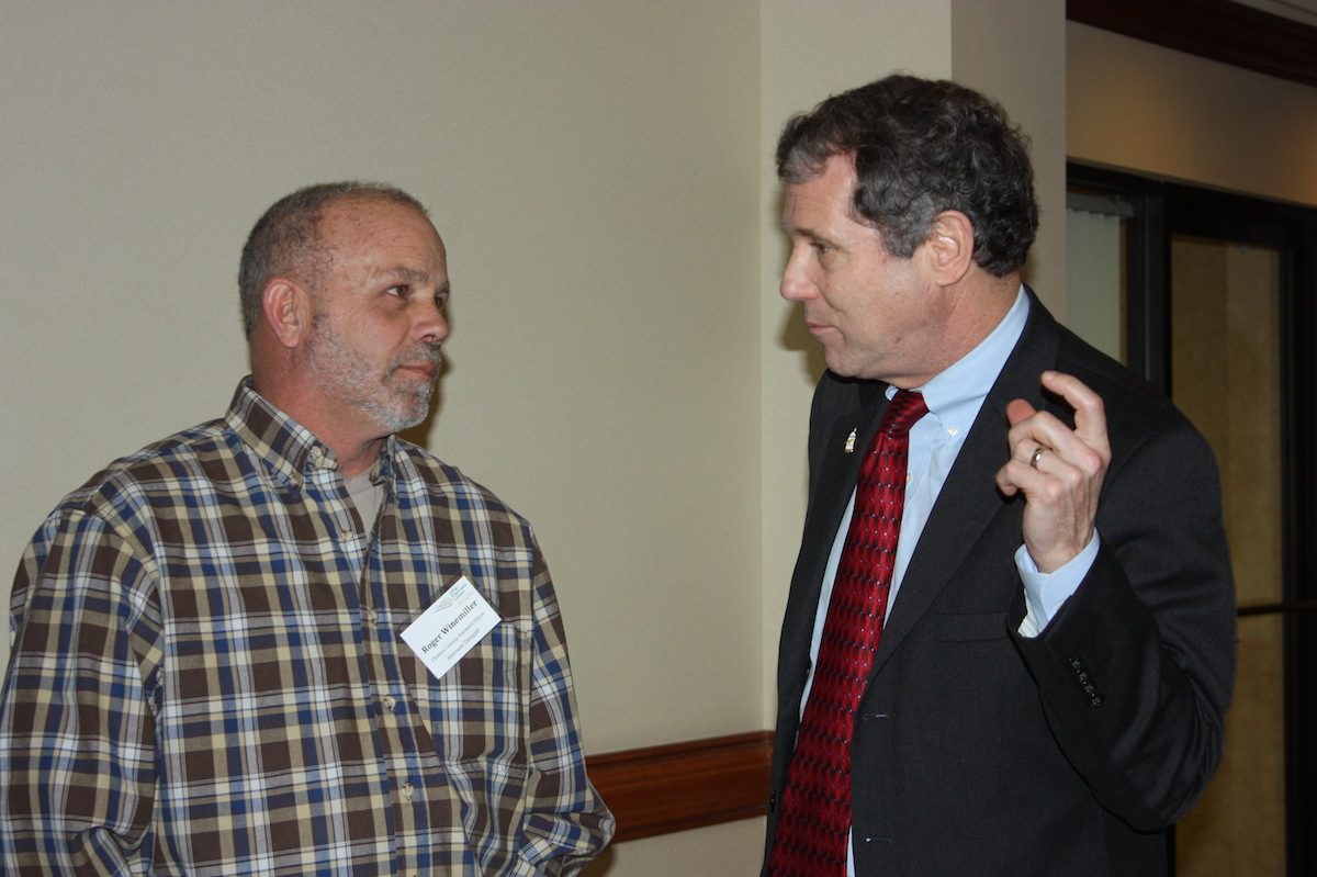 U.S. Sen. Sherrod Brown (right) talks to Clermont County farmer Roger Winemiller during the Ohio Farmers Union annual meeting Jan. 31.
