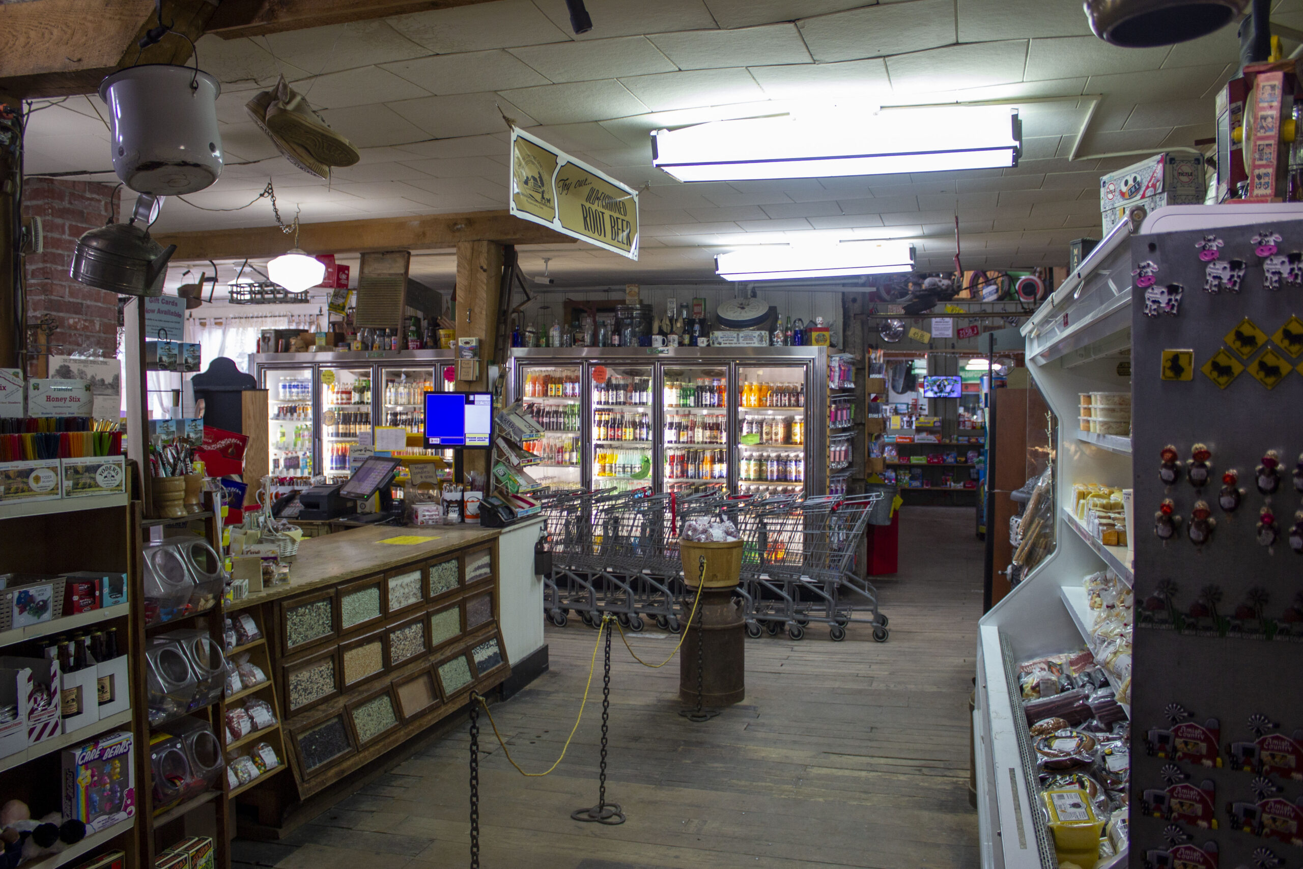 Over time, the store has grown to encompass the former gas station next door, complete with vintage signage. Schaden said that the original idea was to demolish the structure to make way for a parking lot, but the underground tanks were still in good condition, and they did not want to force members of the local Amish community to travel far to get fuel. That left the Schadens’ contractor with the unenviable task of engineering a means to join the old store and gas station, two structures standing side by side but separated by a century. He managed to construct an airy new space with a red brick facade hearkening back to the town’s beginnings that today houses a cafe and new restrooms.
