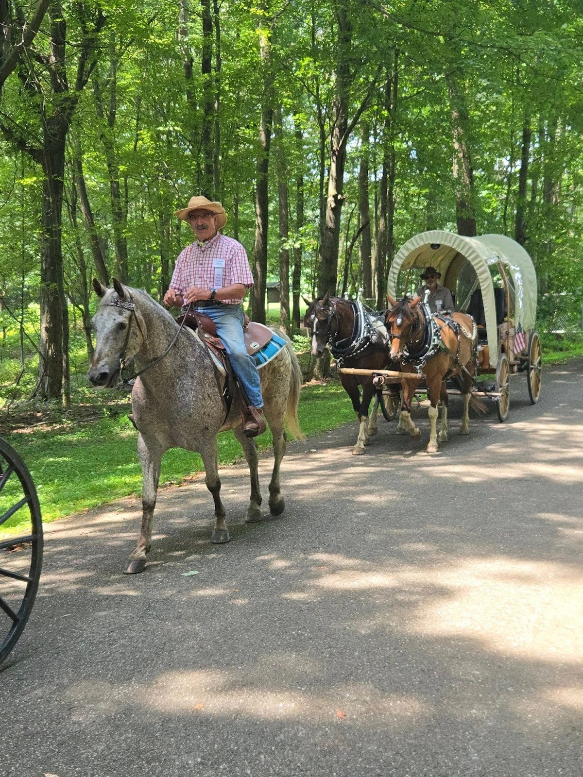 “They’ve been real good,” Connor said, noting the light traffic on these routes which often cut through wooded areas, offering an especially scenic backdrop for the journey. To keep everyone safe, the riders use radios to coordinate around traffic, sending messages to the wagons with reports scouted from ahead.