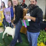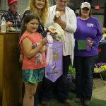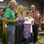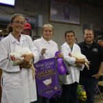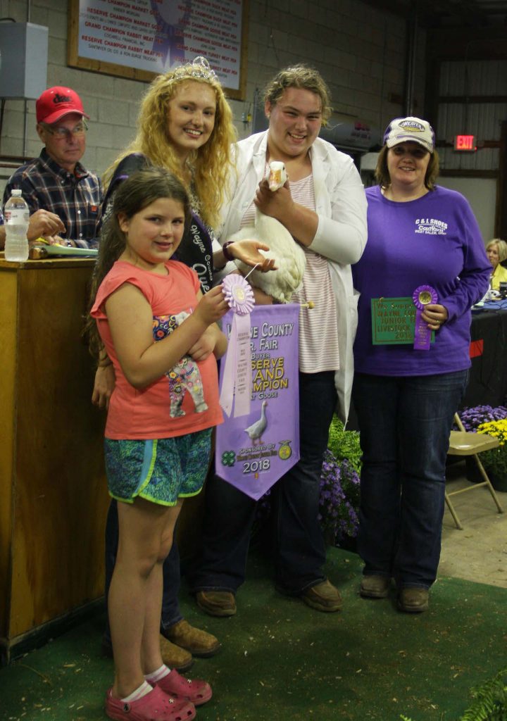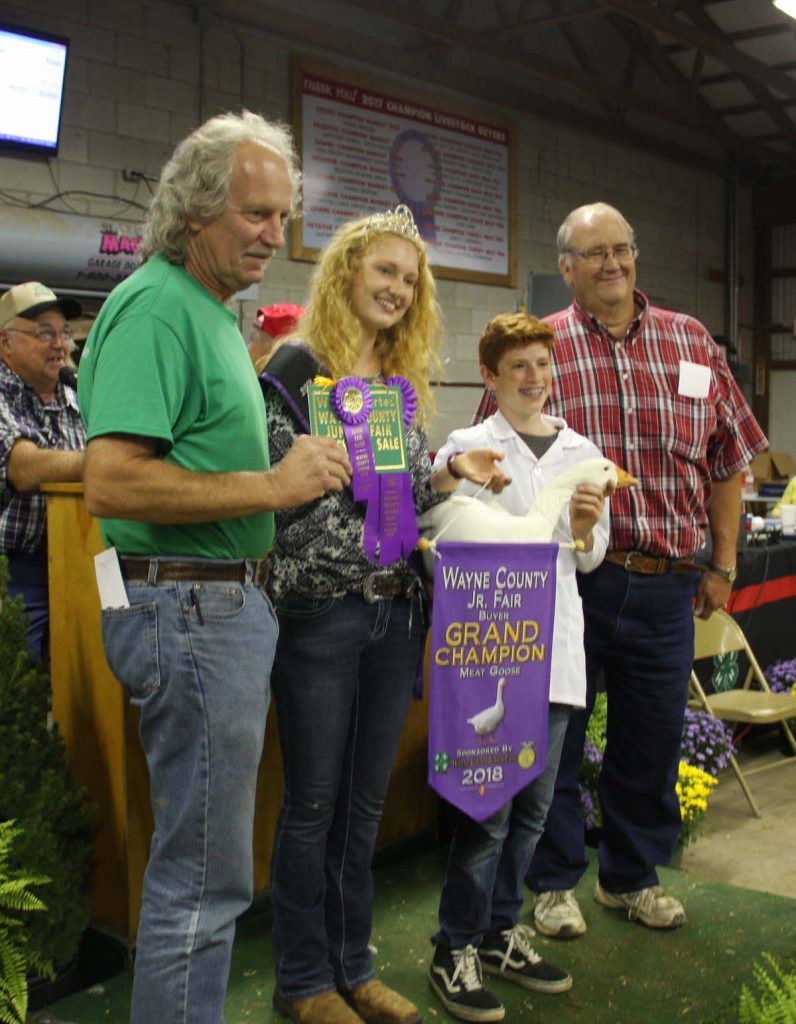 Grady Bickett’s grand champion meat goose sold for $425 to Sterling Fur Company, represnted by Keith Winkler and Tom Miller. Also pictured is Lily Bickett.