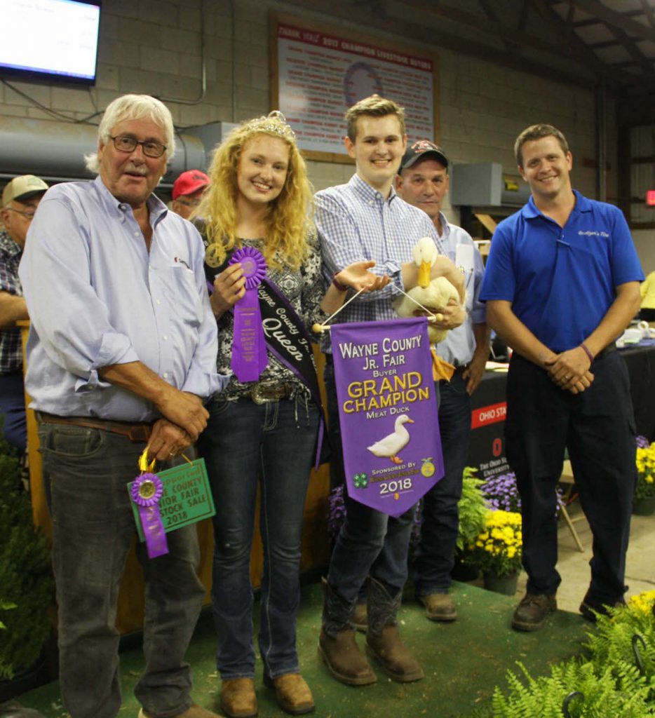 Charlie Bickett’s grand champion meat duck sold for $525 to Terry Santmyer, Santmyer Oil, Scott Burge, Ron Burge Trucking and Chad Kieffer, Smetzer Tires. Also pictured is Lily Bickett.