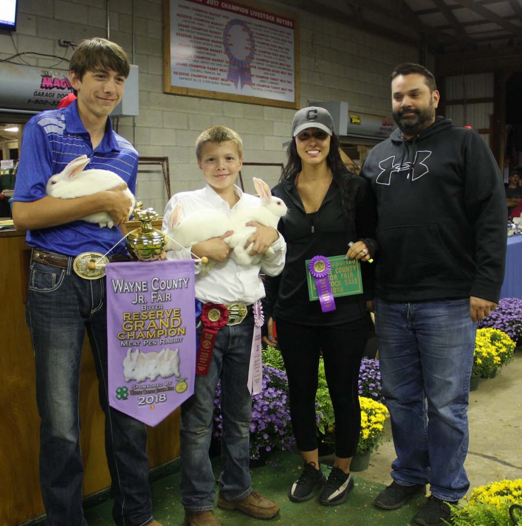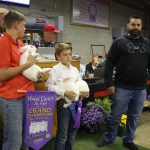 Cole Walenciak’s reserve grand champion pen of meat rabbits sold for $900 to Jason Carrick and Kylee Myers, for the Clothing Wearhouse. Also pictured is Clay Johnson.