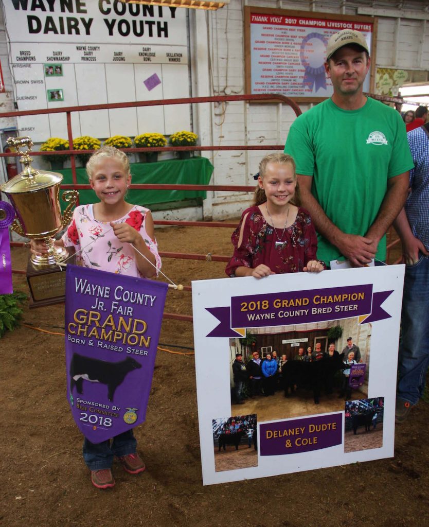 Delaney Dudte’s 1,285-pound champion Wayne County bred steer sold for $4.75 to Jim Tucker, for Marshallville Packing and Orrville Trucking. Also pictured is Hayley McKelvey.