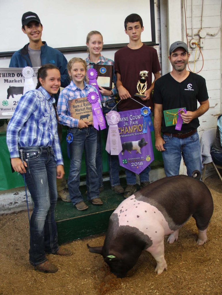 Garrett Cramer, of Cramer Oil, bid $9 per pound for McKayla Feikert’s 274 pound champion Wayne County bred market hog. Also pictured is Seth Crilow, Mia Mariola, Alivia Crilow and AJ Rhodes.