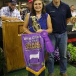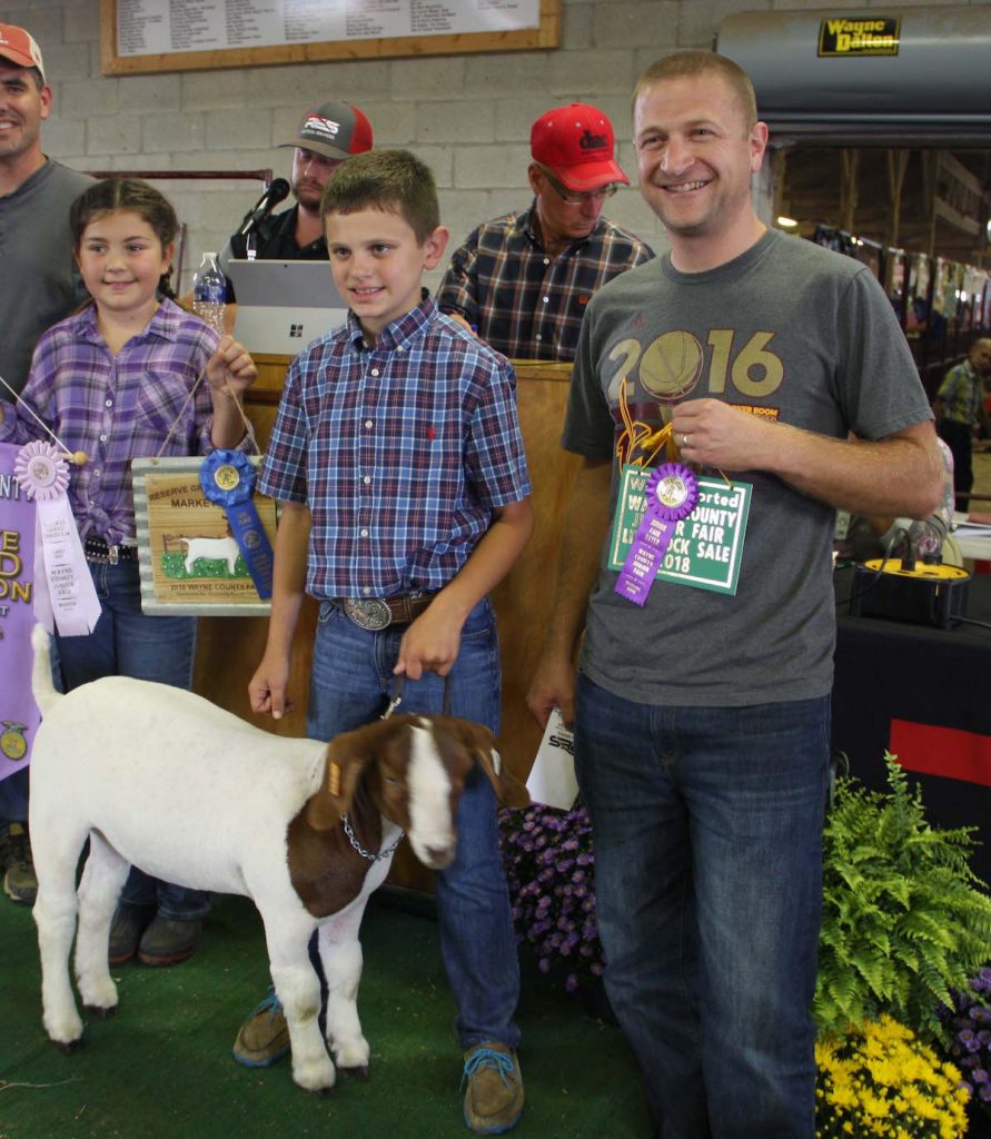 Kendra Marty’s 75-pound reserve champion Wayne county bred market goat sold to the Clothing Warehouse, represented by Jason Carrick for $1,950 per head. Also pictured is Kenzie Saunders.