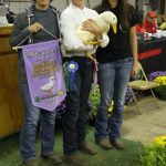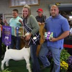 Kyle Piscione’s 87-pound champion meat type market goat sold to Jamie Bowman, Just Kiddin Around, for $2,300. Holding the goat is Cade Tegtmeier. Also pictured is Riley Stull.