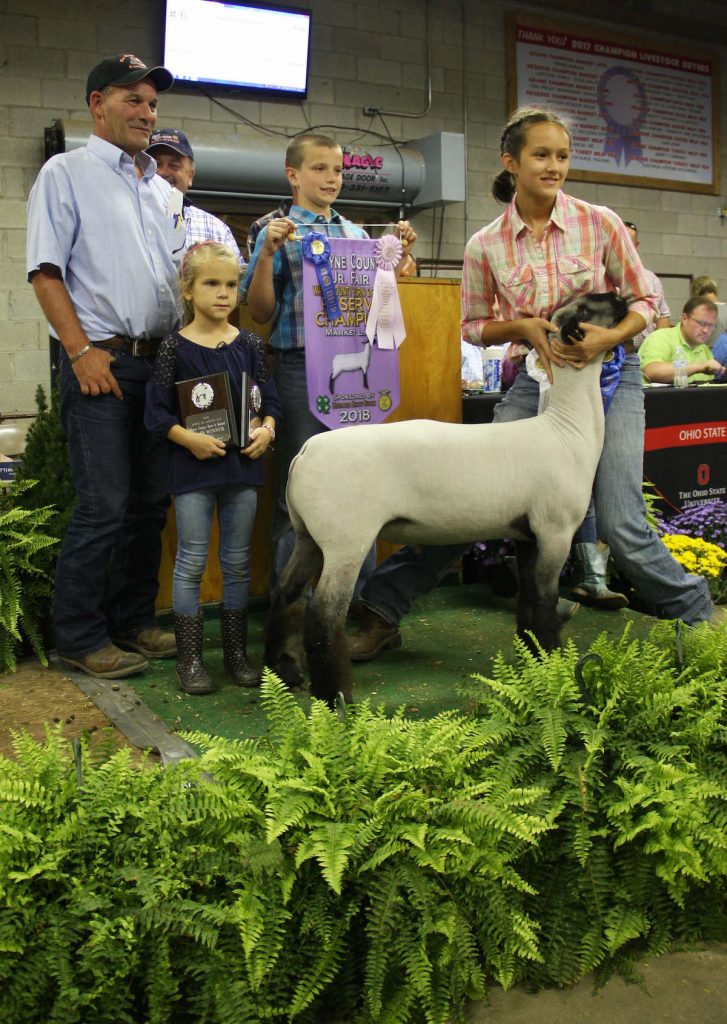 The Clothing Warehouse, represented by Jason Carrick, Kylee and Jaycee Myers bid $23 per pound for Morgan Evin’s 274 pound champion market hog. Also pictured is Kaylee Scale and Kaleb Badger.