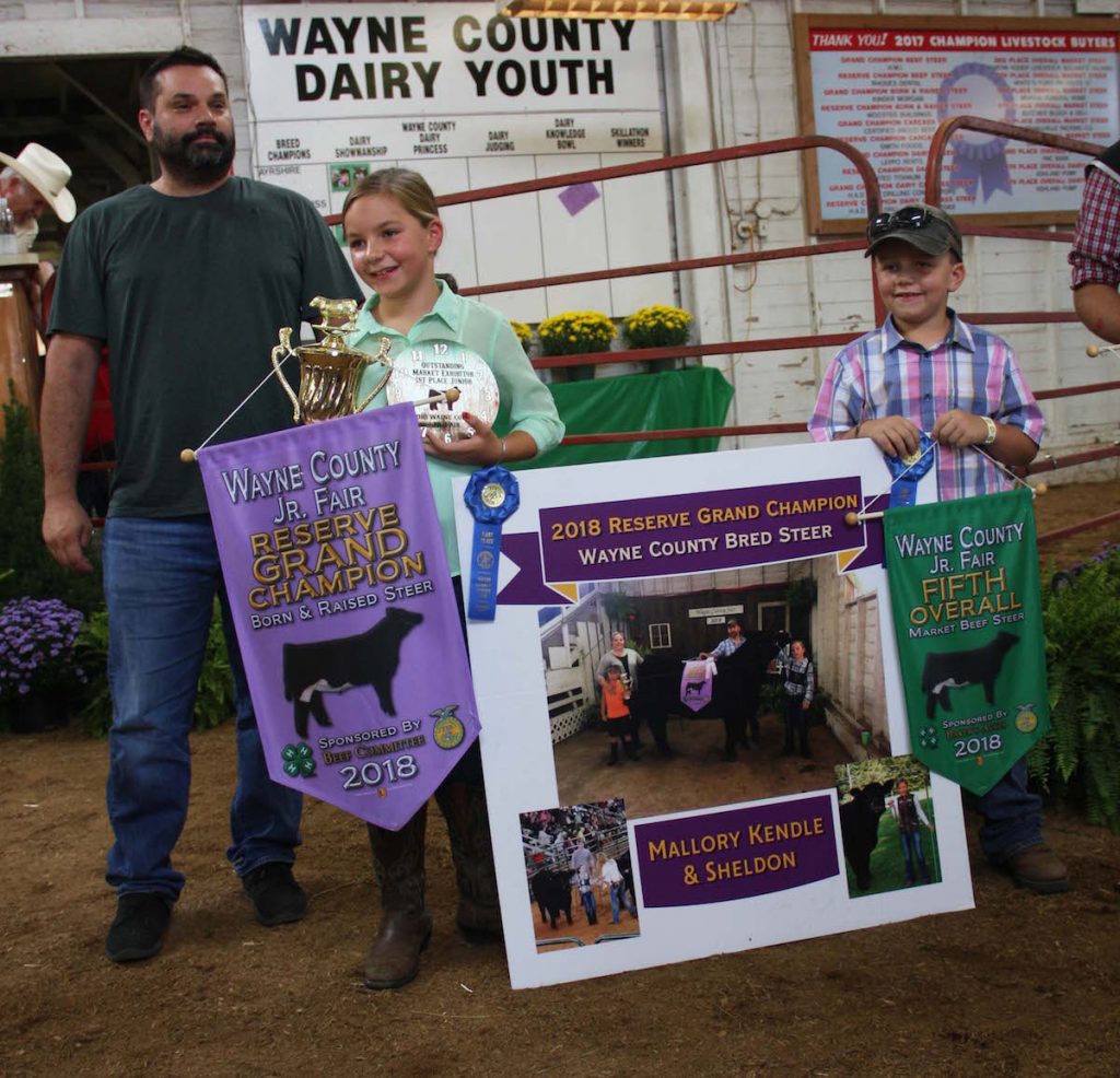 Mallory Kendel’s 1,375-pound reserve champion Wayne county bred steer sold for $3.25 per pound to the Clothing Warehouse, represented by Jason Carrick. Also pictured is Maverick Kendel.