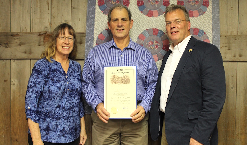 He presented the Ohio Bicentennial Farm Award to the Baer family farm, run by Elmer and Carolyn Baer.