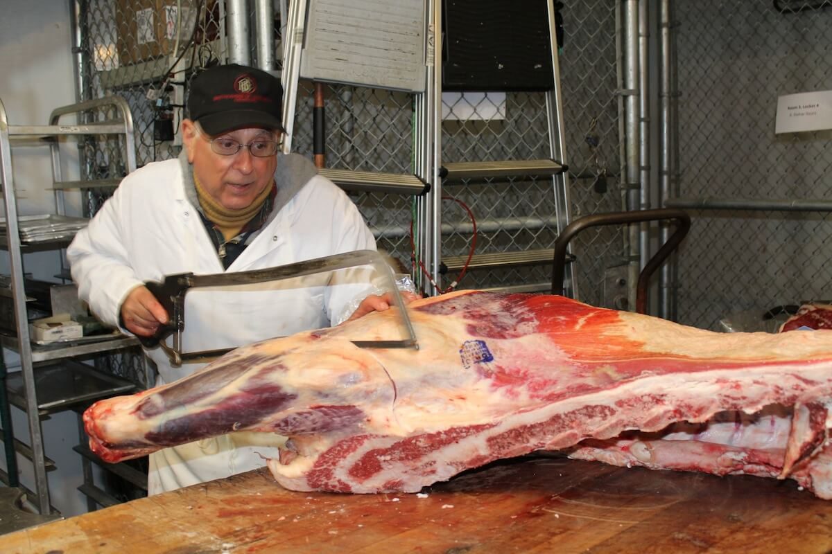 Clothed in a white butcher’s apron, a black cap and the vigor of someone who clearly loves his job, he cuts and saws his way through whole quarters of beef, including the hearts, livers and tongues.