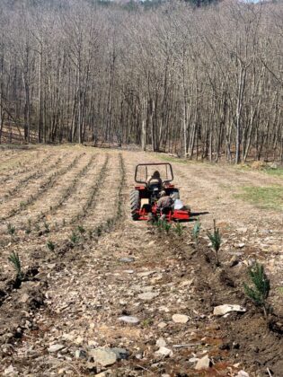 The trees are started in greenhouses and grown there for 26 weeks. Then they are planted in transplant beds, where they’ll stay for a growing season or two.