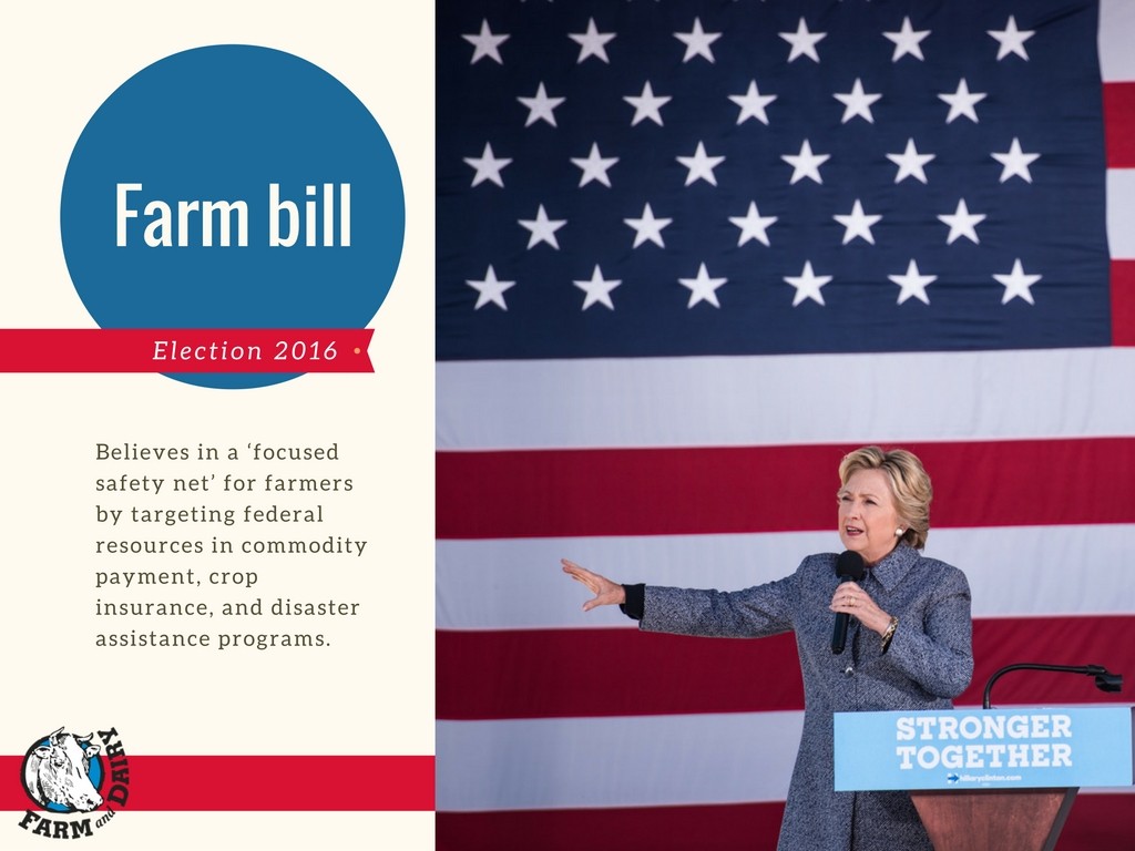 Trump: Plans to be an “active participant” in writing the next farm bill, and also “delivering it on time.” Supports a strong safety net for farmers and believes his Agriculture Advisory Committee represents ag issues across the country and in local communities.