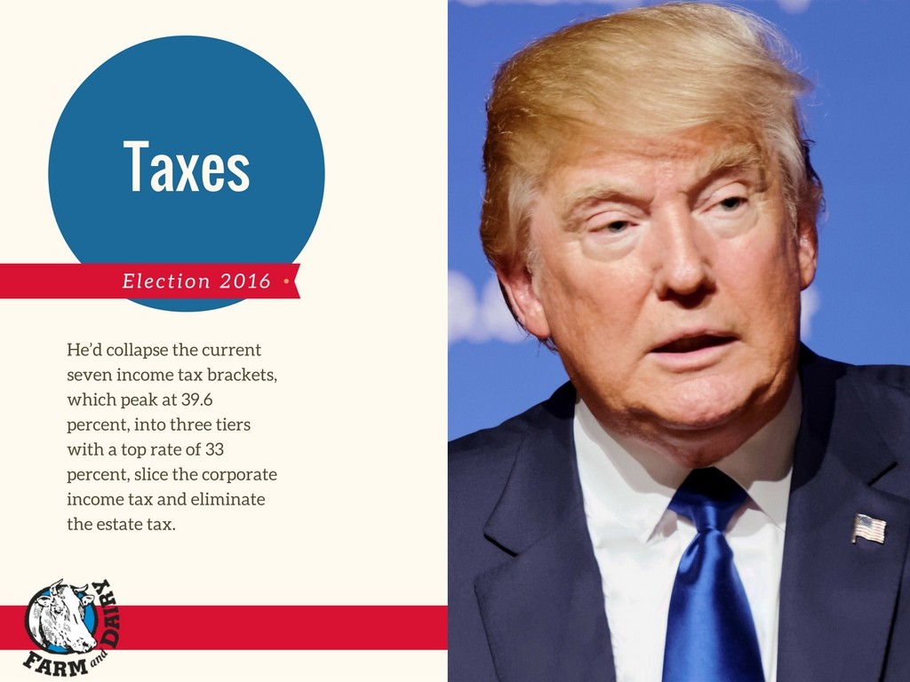 Trump: Is intent on cutting taxes. He’d collapse the current seven income tax brackets, which peak at 39.6 percent, into three tiers with a top rate of 33 percent, slice the corporate income tax and eliminate the estate tax.