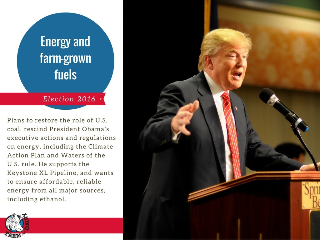 Trump: Wants to implement an “America-First Energy Plan” that enables the U.S. to become the world’s leader in energy production and gets the government out of the way of innovation. Plans to restore the role of U.S. coal, rescind President Obama’s executive actions and regulations on energy, including the Climate Action Plan and Waters of the U.S. rule, and lift moratoriums on energy production in federal areas. He also supports the Keystone XL Pipeline, and wants to ensure affordable, reliable energy from all major sources, including farm-grown fuels like ethanol.