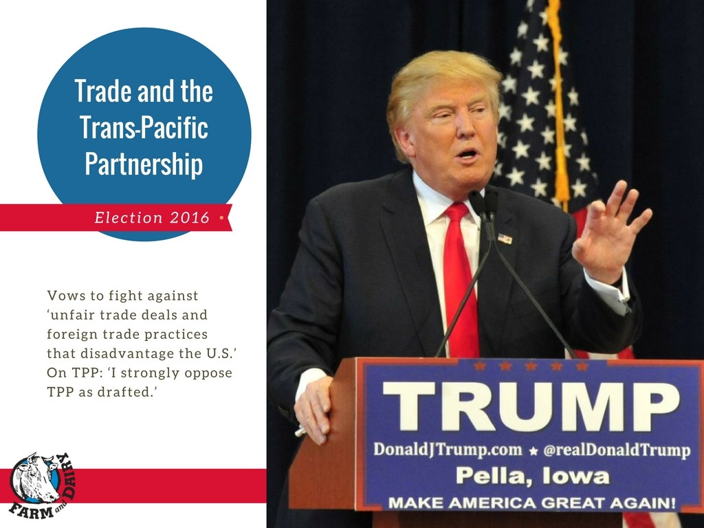 Trump: Plans to defend the economic interests of American workers and farmers on the world stage. Vows to fight against “unfair trade deals and foreign trade practices that disadvantage the U.S.” On TPP: “I strongly oppose TPP as drafted.”