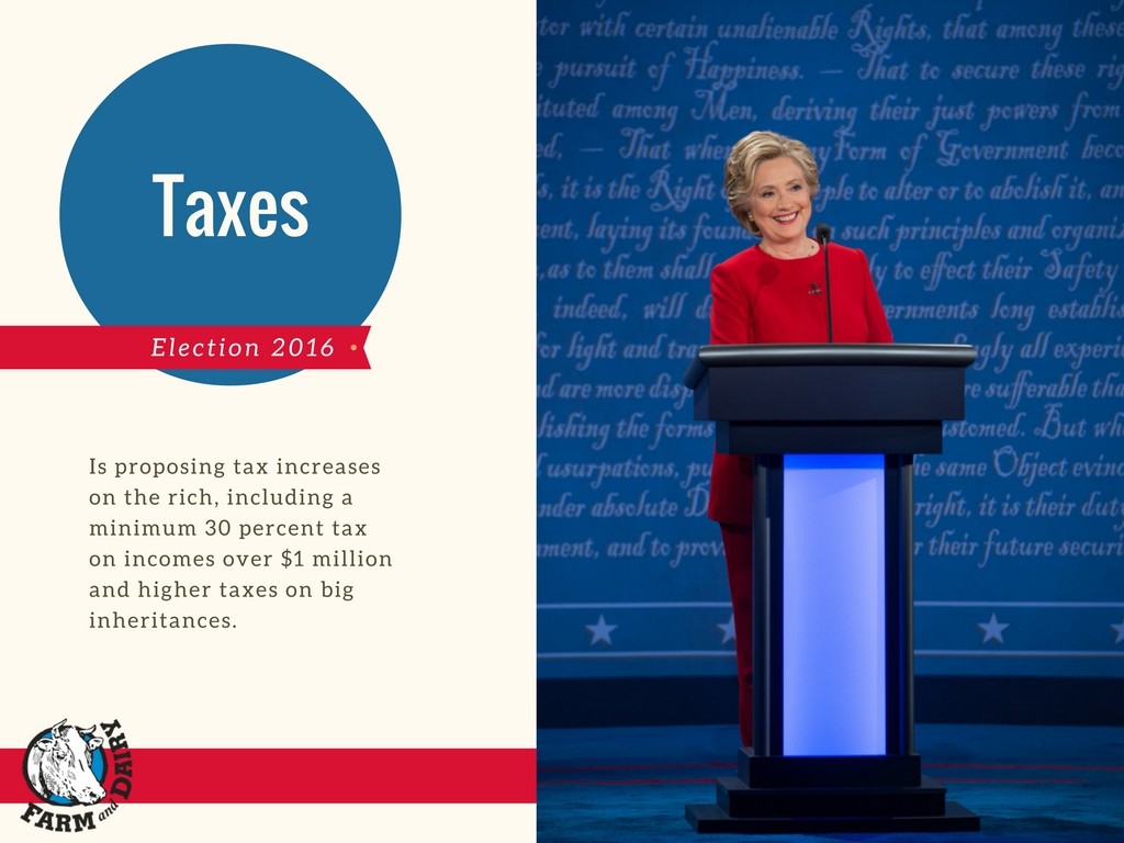 Clinton: Is proposing tax increases on the rich, including a minimum 30 percent tax on incomes over $1 million and higher taxes on big inheritances. Most taxpayers would see little or no impact on their tax bill, but the government might look different.