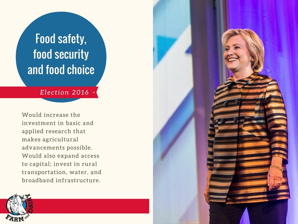 Clinton: Says that the “ingenuity of America’s farmers and ranchers” has provided consumers across the world with access to better, safer, and a wider variety of food options than ever before. She believes that supporting that ingenuity goes hand in hand with ensuring food quality and safety.