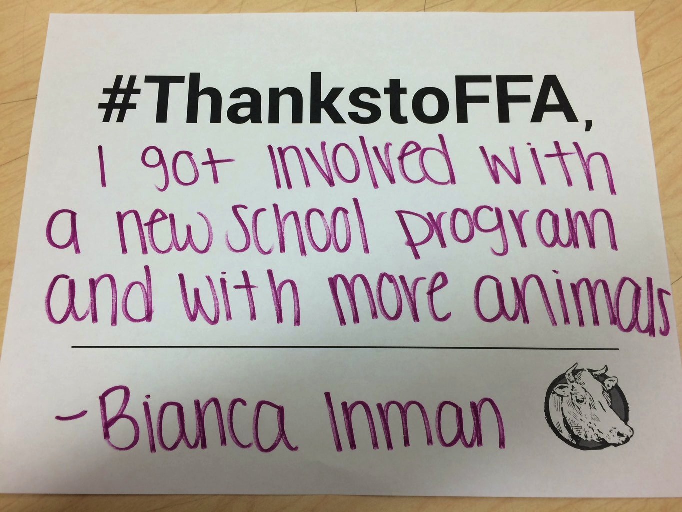 Bianca Inman of Firelands FFA, in Oberlin, Ohio, said #ThankstoFFA she is more involved and gets to work with animals.