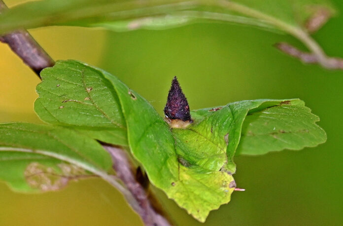 There is a tiny gall wasp that lays its eggs in the leaves of witch hazel. As I mentioned in my August article on oak apple galls, a gall is an abnormal growth found on a plant, caused by eating or egg-laying activity of an insect. When a gall wasp deposits an egg, it injects hormones that aid in the creation of the gall structure itself by altering the leaf’s typical growth pattern. Slowly, the affected section of leaf begins to grow, aberrantly, around the egg, getting larger as the leaf matures. The size and shape of the gall is indicative of the species that created it. It just so happens that the galls found on the leaves of witch hazel are conical and pointy, very much resembling that of a witch’s hat.