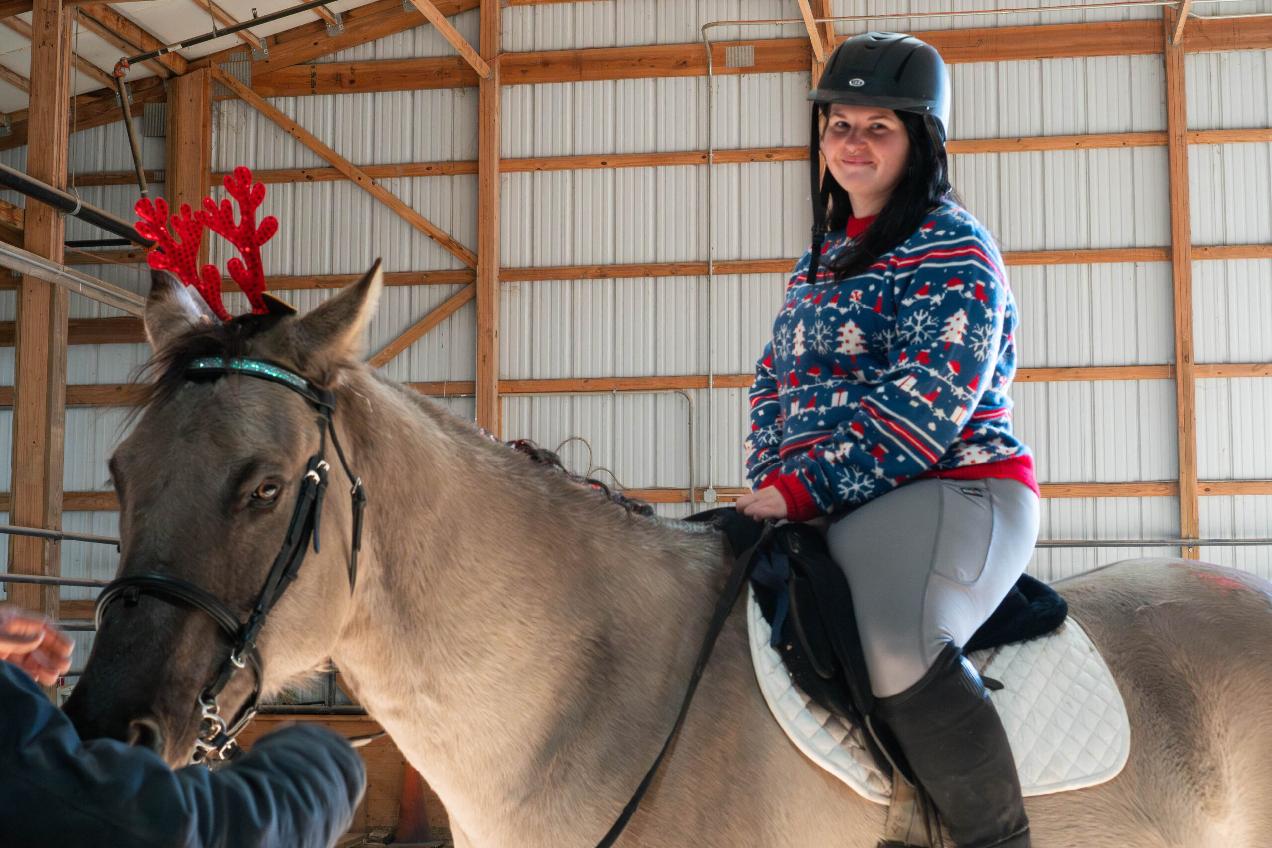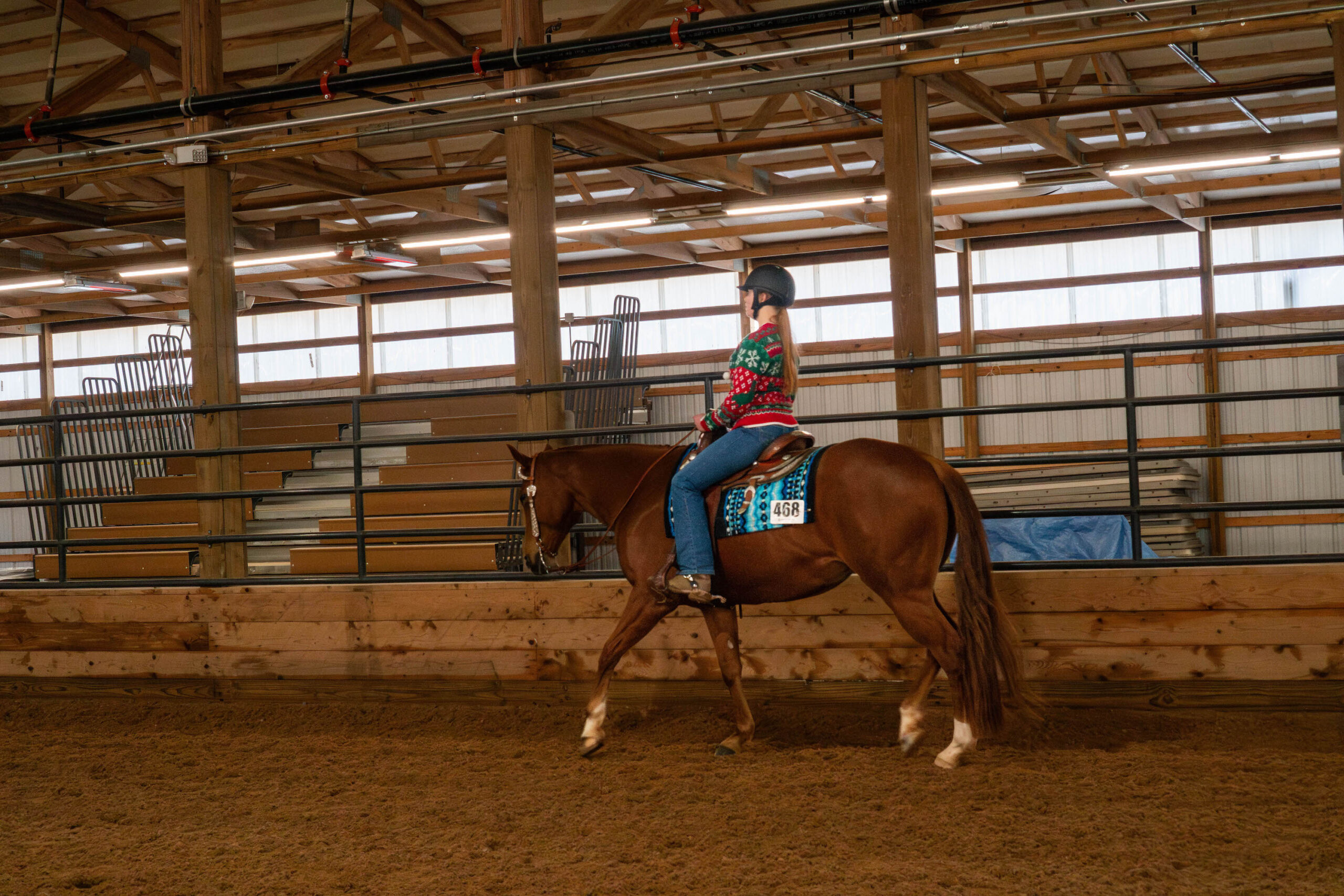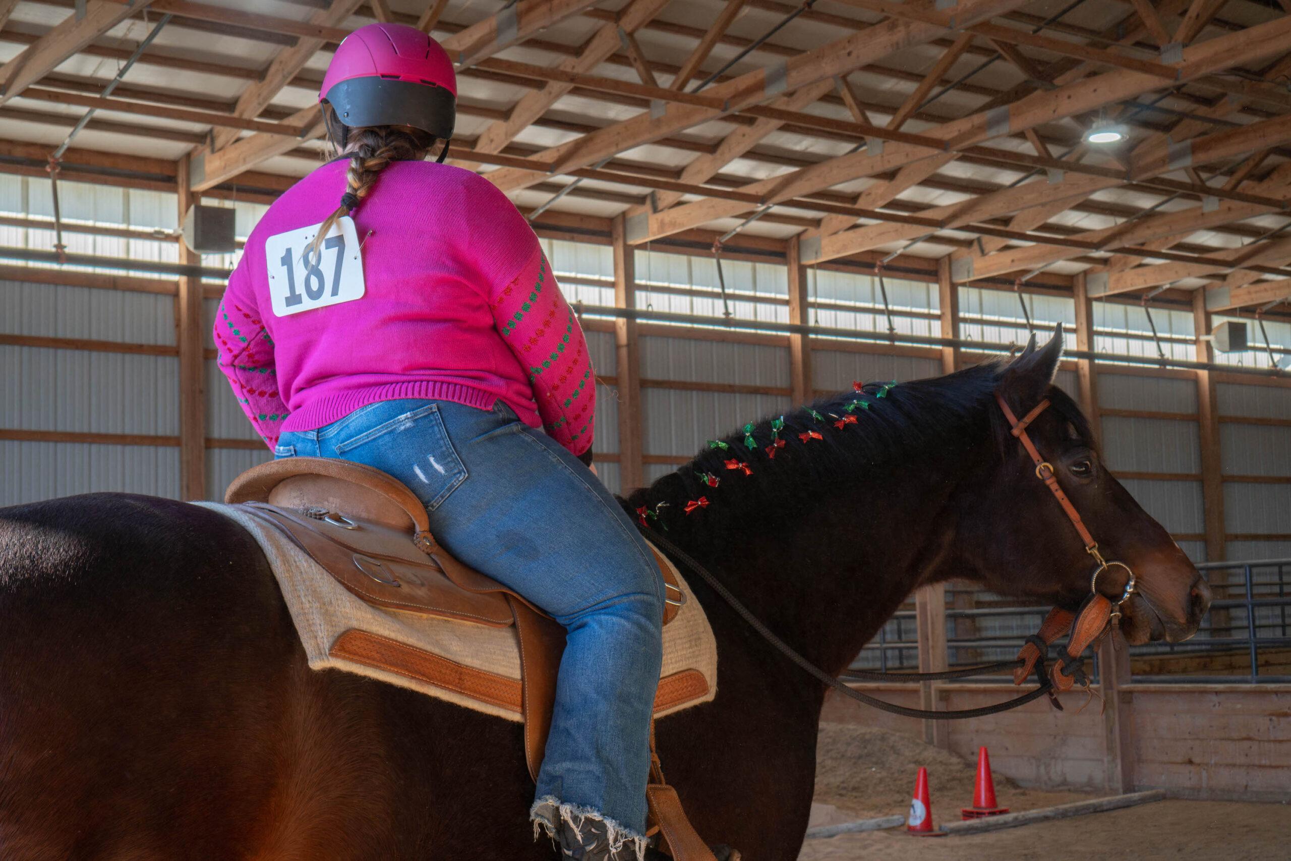 At the show this year, riders sported ugly Christmas sweaters with llamas and cows on them. The horses also wore festive attire, including Santa hats, reindeer antlers and red and green bows braided in their hair.