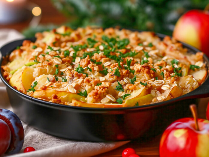 - Layer apples in bottom of casserole dish. In small bowl, whisk together sugar and apple juice. Slowly whisk in flour until smooth. Pour over apples.