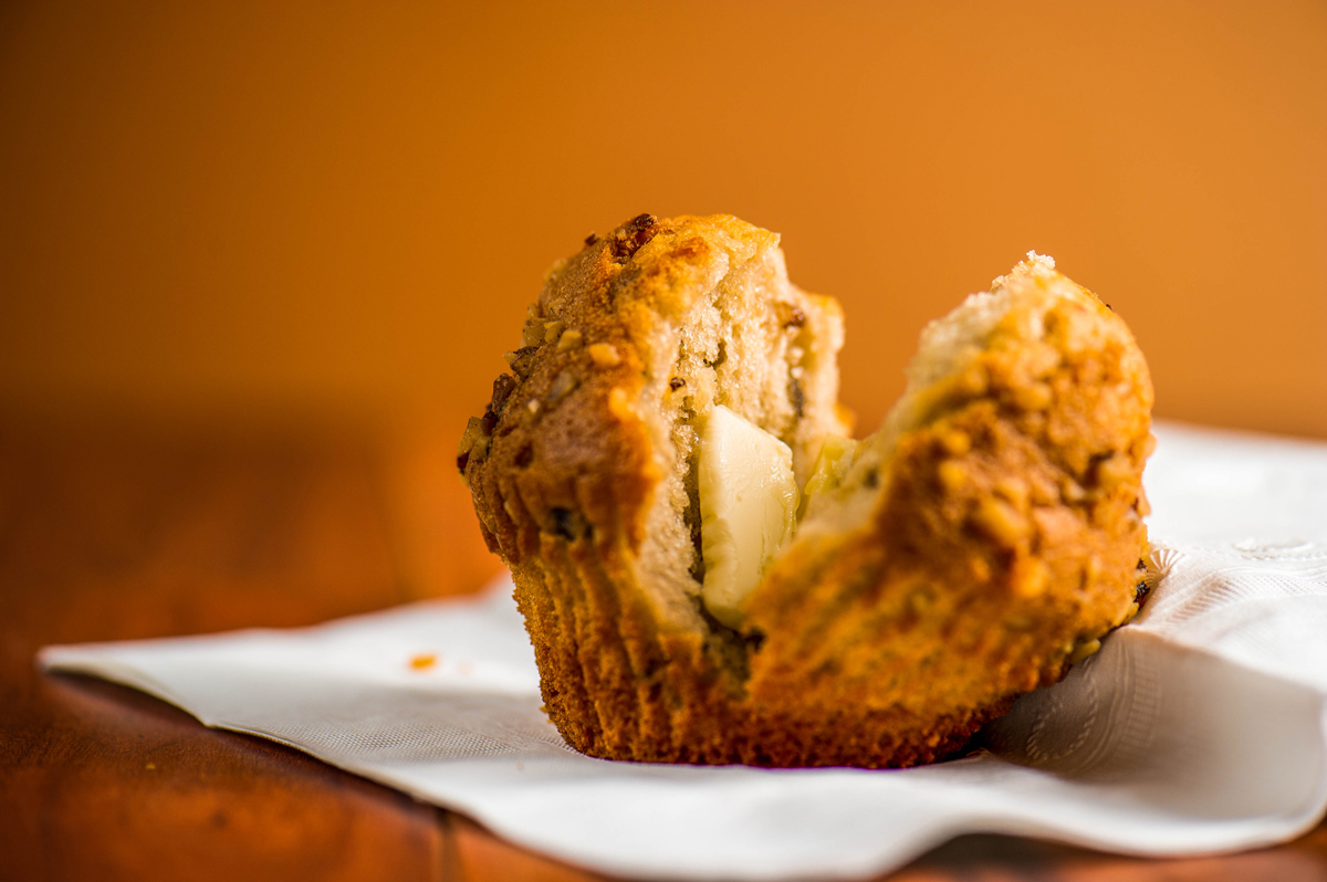 - Fill greased muffin tins or paper muffin cups about 2/3 full. Sprinkle with cinnamon sugar.
